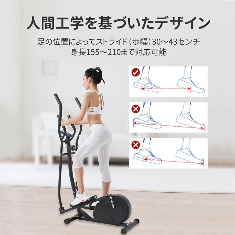 商品名家庭用エリプティカルバイク本体size(cm)W47 × L80 × H156本体重量(kg)28負荷方式マグネット式負荷(8段階)使用電源ACアダプタ100V連続使