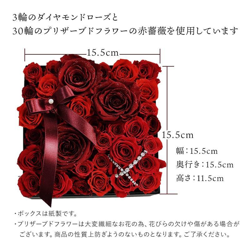 人気のダイヤモンドローズを使用したプリザーブドフラワーのフラワーボックス。 33本のバラには「生まれ変わっても一緒にいたい」という意味があり、プロポーズにぴったりなフラワーボックスで