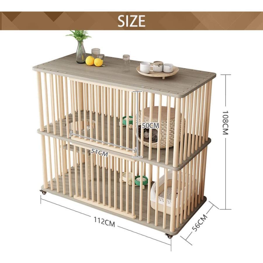 【商品サイズ】商品サイズ:幅112cm×奥行56cm×高さ108cm、2段重さ25kg。 素材:猫のケージはE1グレードの無垢材でできており、環境に優し