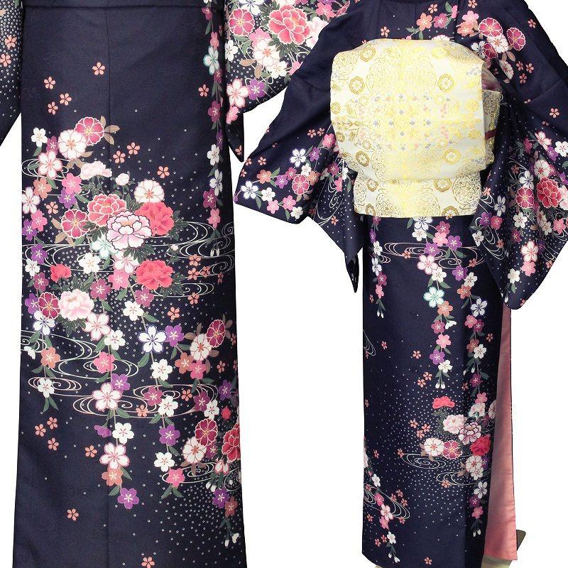 ほぼ黒地に見える濃紺地に、しだれ桜と流水を染めました。とても色気のある訪問着です。撮影や舞台衣装、商用イベントの衣装などにおすすめです。着物、袋帯(または京袋帯)、帯揚げ、帯締め